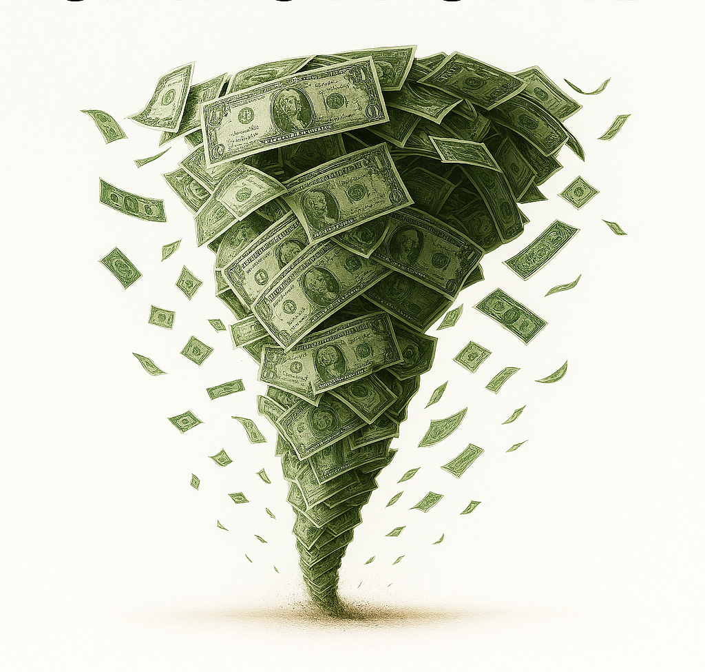 So, I’m working on ideas for a new cover page. At present my best idea is to try to combine an image of a catastrophe with money somehow. I’ve plugged a few ideas into AI, and the best result so far is this. What do you think?